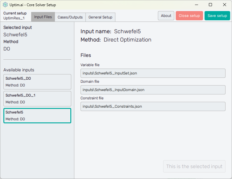 The left section of the screen contains the general information about the Selected input. There is its name together with the Method to be used in the Uptimai Solver (in this case the Direct Optimization) that was identified automatically from files of the selected input. Users can change the set of inputs (together with the method, eventually) from the list of Available inputs below.