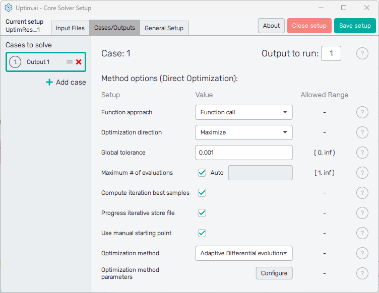 Here the user defines solver options for all cases in the current setup. Cases are listed in the left section of the program window, as seen in Figure 2. It is possible as many cases as needed, the Uptimai Solver will process them in the order prescribed by the list. The position of each case in the list can be changed by ist mouse-dragging by its = symbol. Clicking the X icon of the item will remove the case from the list. Other cases can be added to the list via the + Add case below the list.