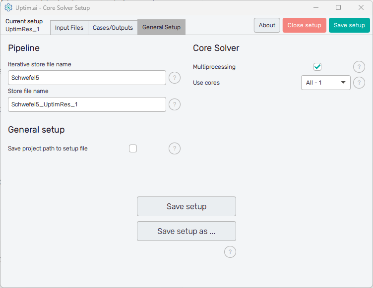 - General Setup : The user can define the names of model result files as well as computational resources reserved for the Uptimai Solver