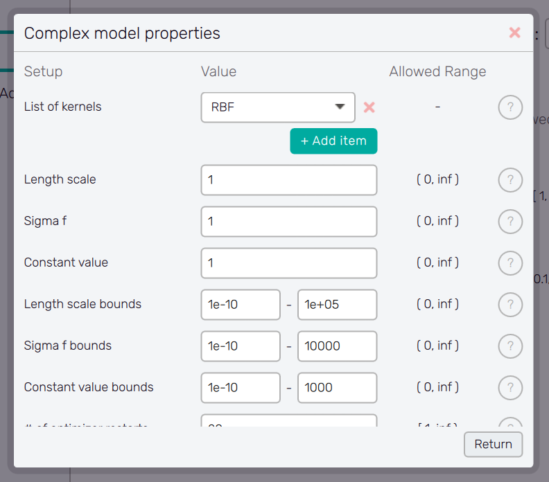 - Gaussian : The standard Gaussian process, with defined kernel functions and an added white noise kernel, preferable for handling noisy problems.