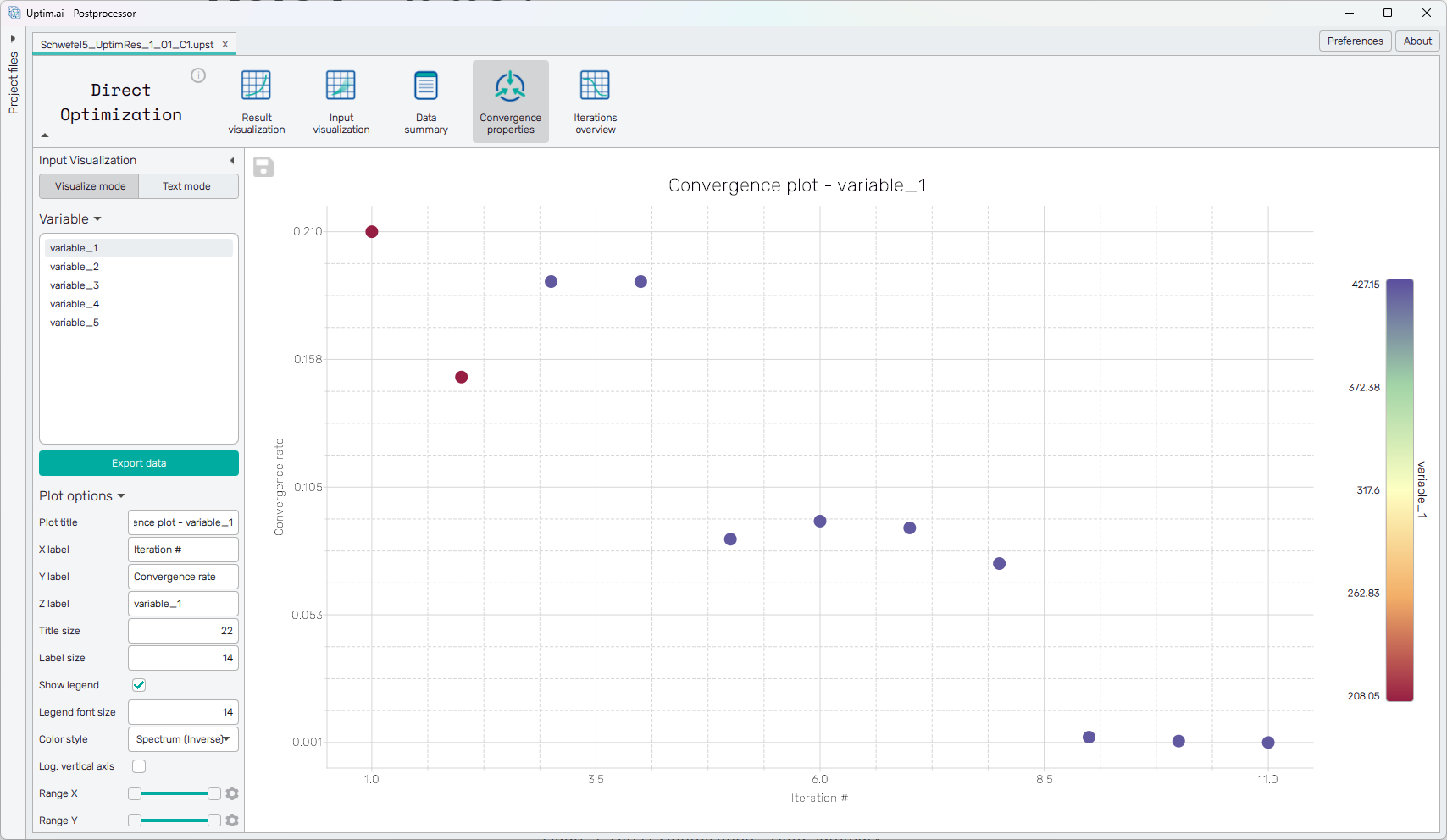 The convergence rates are presented in the form of a scatter plot (shown in Figure 1). The X-axis represents the iteration number. The Y-axis shows the convergence rate. Finally, the coloring of the markers in the scatter plot represents the value of the selected input parameter in the optimal sample known in each iteration.