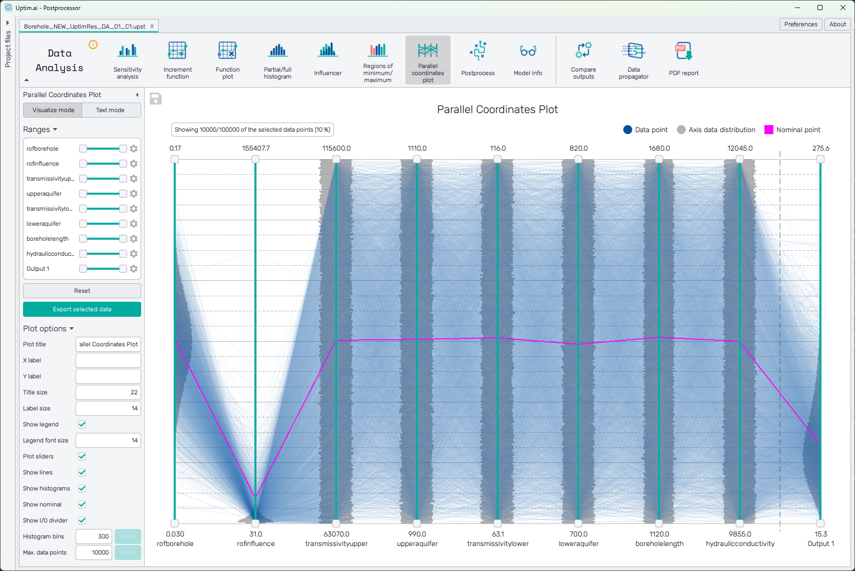 The Parallel Coordinates Plot is a visualization for exploring high-dimensional datasets. Each input or output variable is represented by its own vertical axis, and each design point (sample) is drawn as a polyline intersecting all axes at its respective values. In addition, each axis distribution is visualized using a histogram. In case of the Result file (.upst), the visualized points are the Monte-Carlo samples from the data file, propagated through the model.