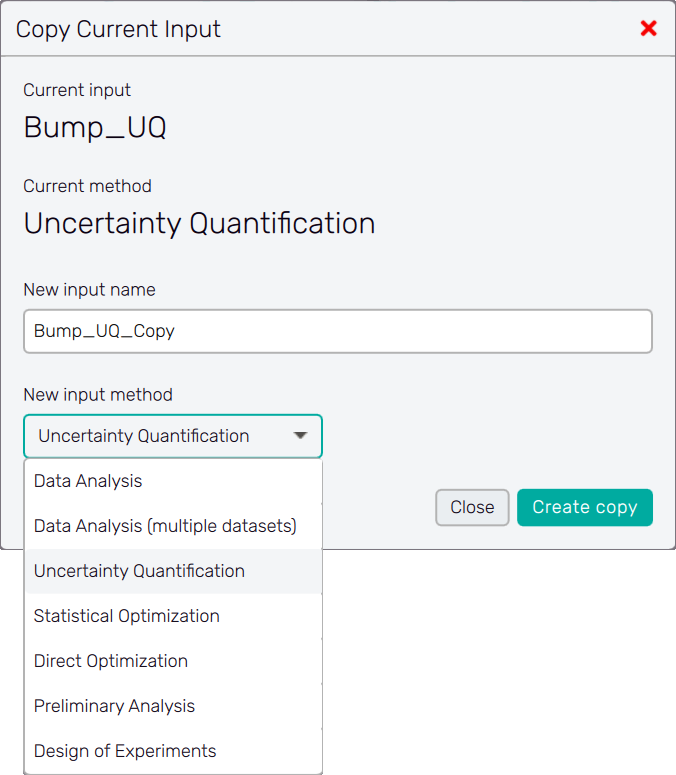 A copy can be created from the current input using the dialogue in Figure 2. The user can change the method for the copy of the input using the New input method and also set the input name for the copy. That functionality is useful when several methods want to be applied in the same project
