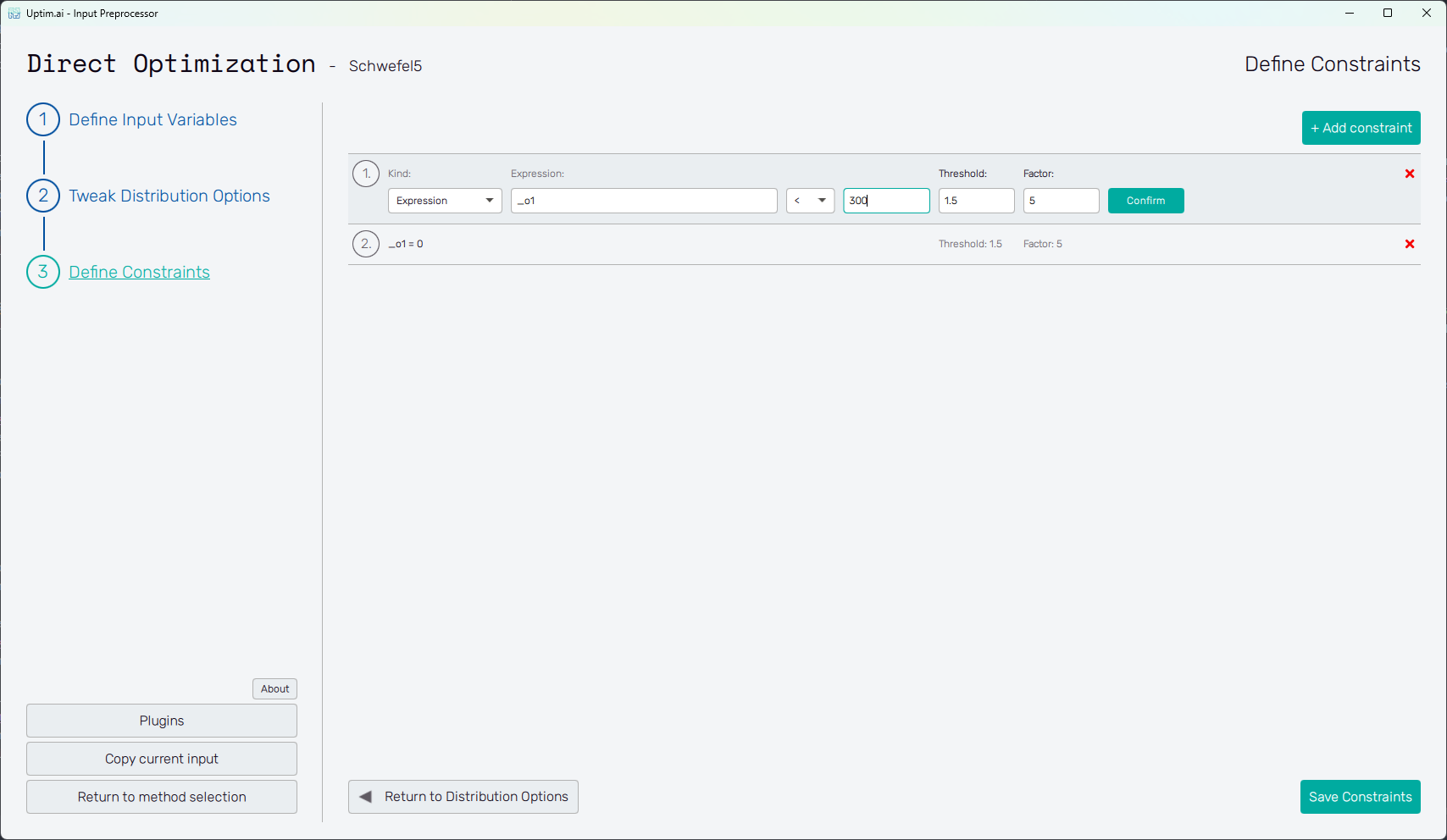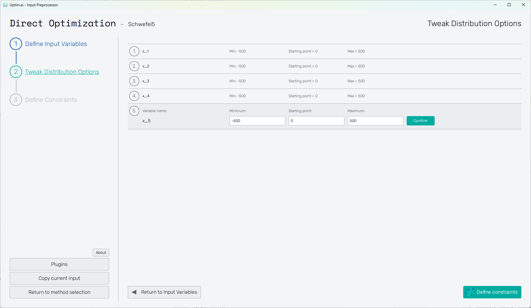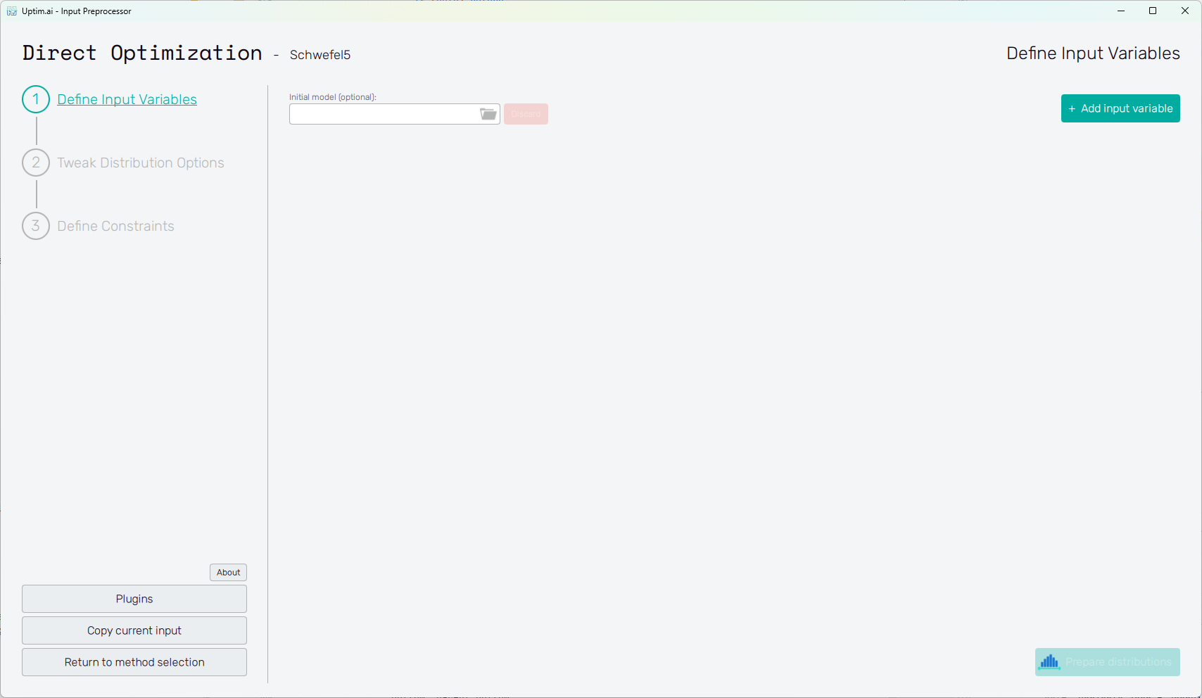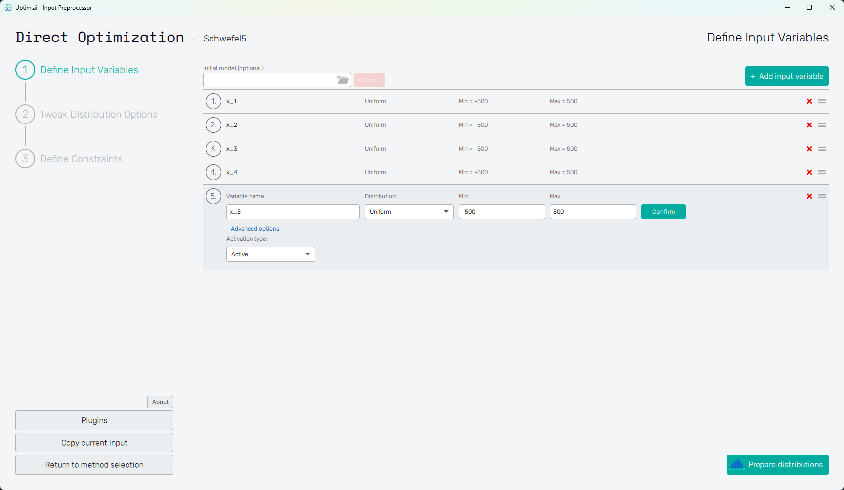 Adding one or more input variables activates the Prepare distributions button. This one invokes the preparation of randomly distributed samples according to the settings. In case there are invalid entries in the input variable definition, the user is informed and not allowed to continue to the next step until everything is by the book. Then, the button itself turns into Tweak distribution options, sending the user to this next step. Also, the Tweak Distribution Options item is activated in the fishbone navigation bar on the left.